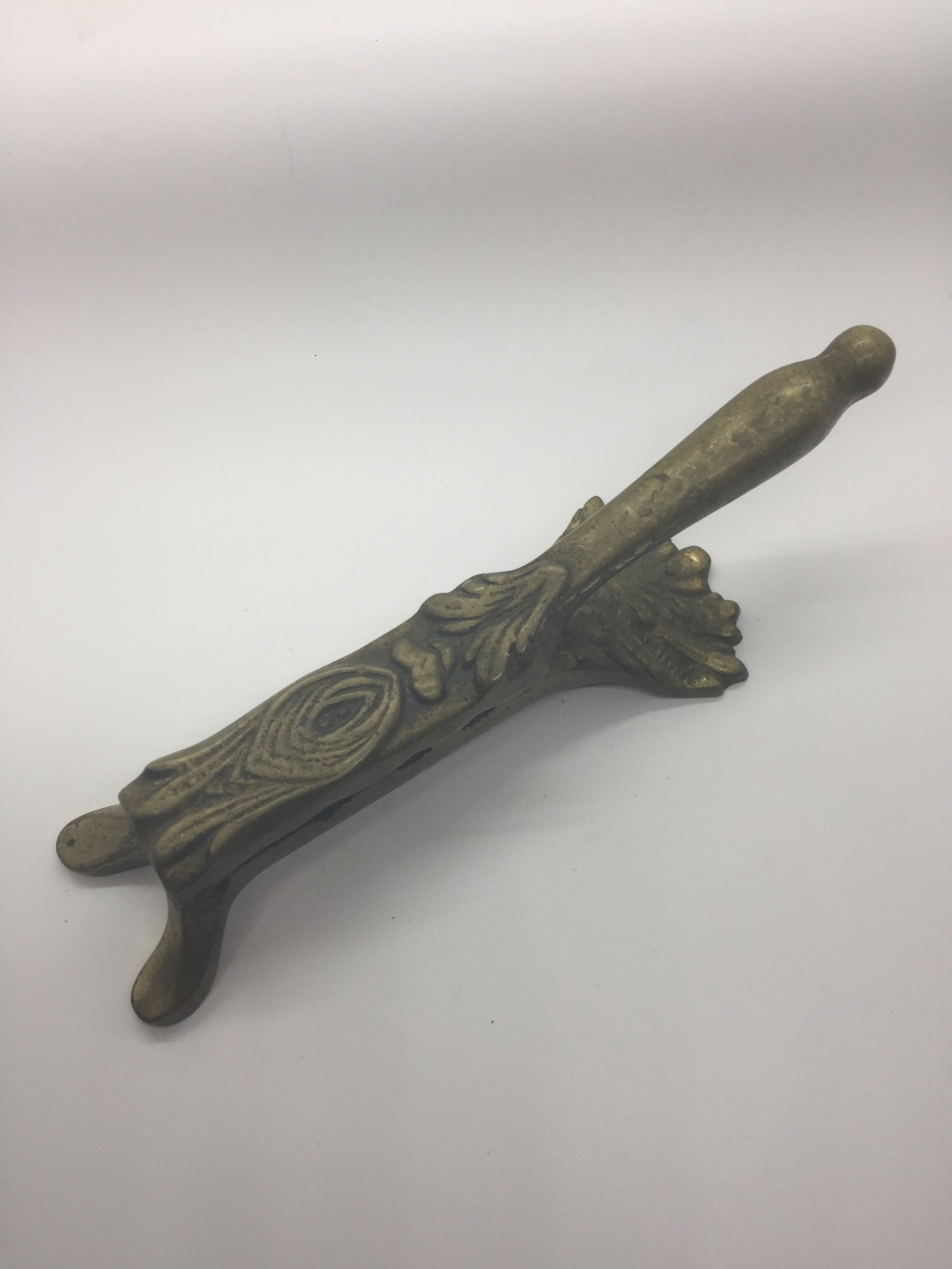 When we picked up this brass item, we were told that it was a nutcracker. Which got us thinking - that’s nuts! There’s no way it’s for cracking nuts, why would it have different sizes? So…we began our journey into researching this curiosity. What we discovered was a huge collection of “Apothecary Cork Presses”…we found ones shaped like animals, some with mounting screw holes, cast iron, brass…a variety of designs ranging from plain to extremely ornate. Most seem to be from the 1800s. The druggist/pharmacist would place a damp cork in the press, then squeeze (or press in this case) down to compress the cork to fit the bottle head. As the cork dries, it expands, sealing the bottle.